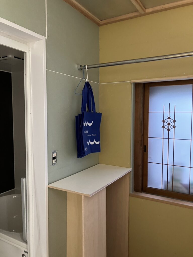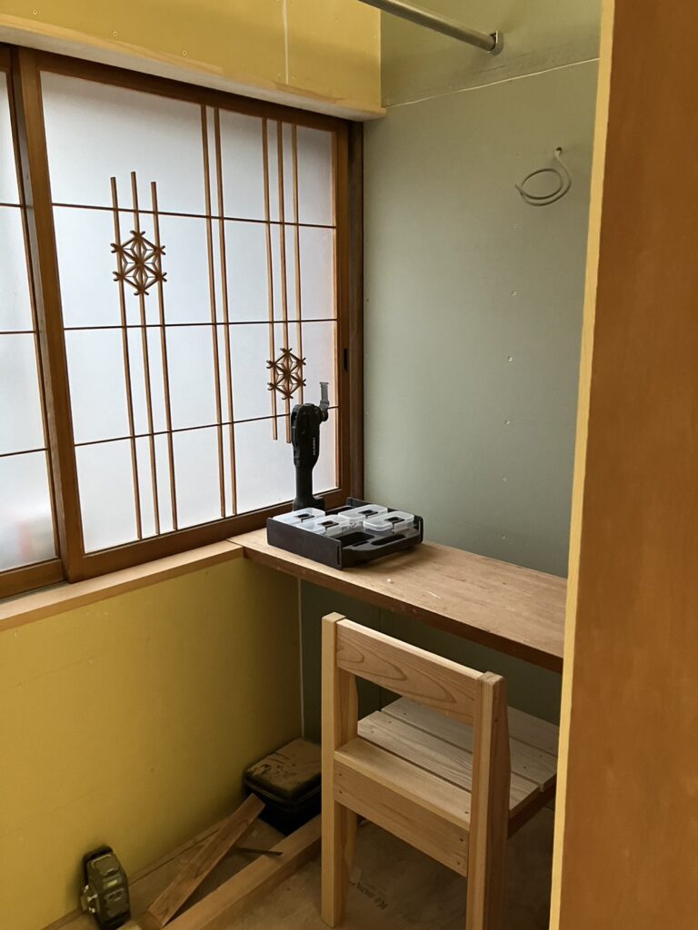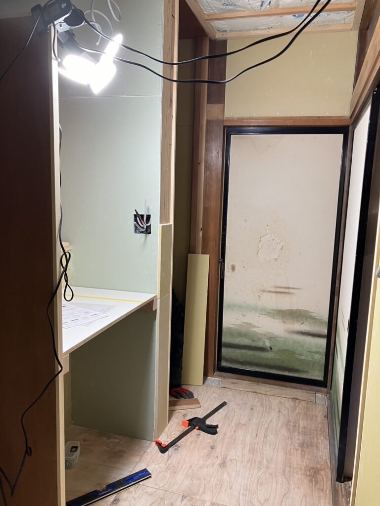 壁仕上げを先に進めた方がいいのはわかっていたが、どうしても空間が先に見たくなっていて手を止められない。最後にマスキングテープでべたべた養生してるだろう。