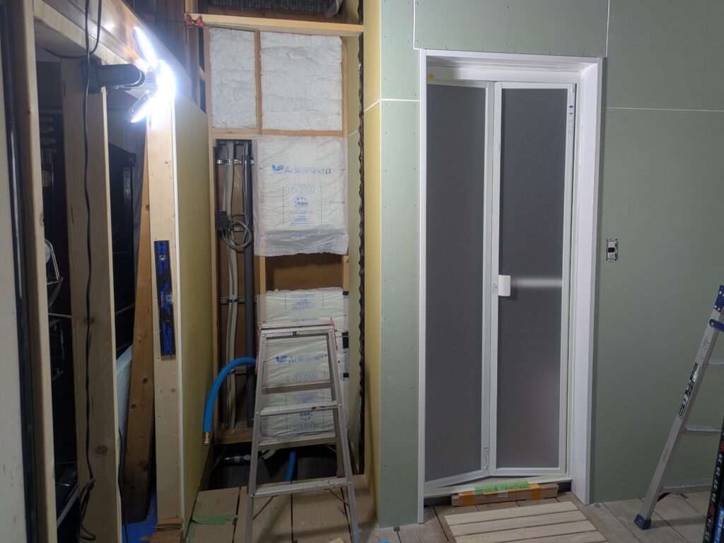 石膏ボードは場所によって厚さ9.5mmと12.5mm、又は普通、防水、超軽量を張り分ける。